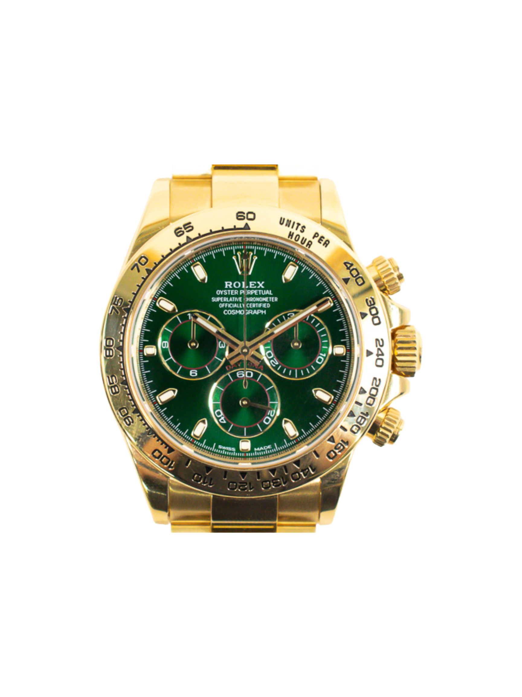 Rolex crafts the 40mm Oyster case from solid 18k yellow gold, delivering substantial weight and a powerful wrist presence. In addition, the polished yellow gold bezel features the engraved tachymeter scale, reinforcing the Daytona’s racing heritage. The vivid green sunburst dial creates dramatic contrast, while applied gold hour markers and luminous hands ensure excellent legibility.
