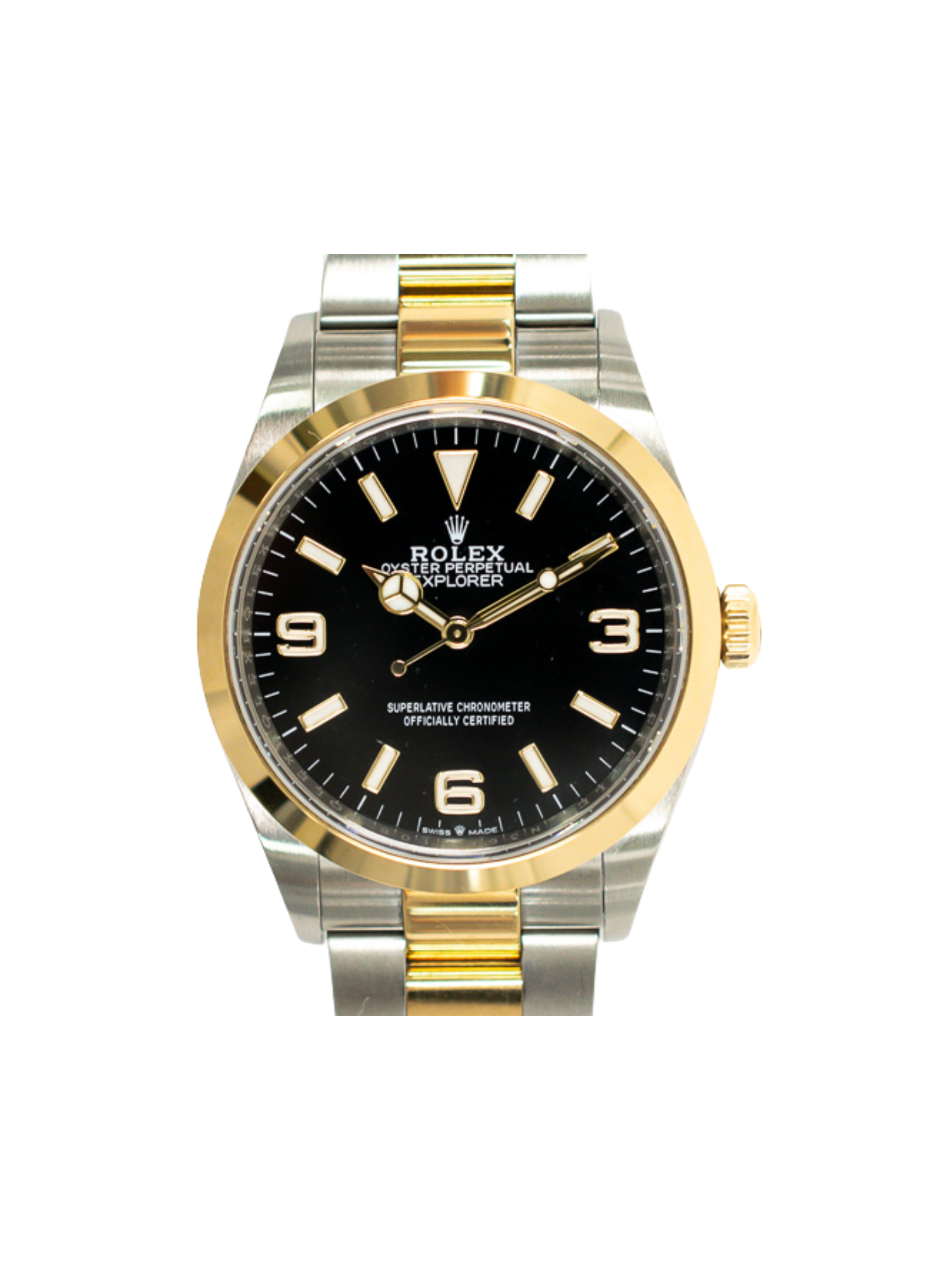 The Rolex Explorer Stainless Steel and Yellow Gold with a Black Arabic Dial embodies adventure, precision, and refined luxury. Designed for explorers and modern professionals alike, this timepiece reflects Rolex’s enduring spirit of discovery. Its bold two-tone construction pairs rugged Oystersteel with elegant 18k yellow gold, creating a striking balance of strength and sophistication.