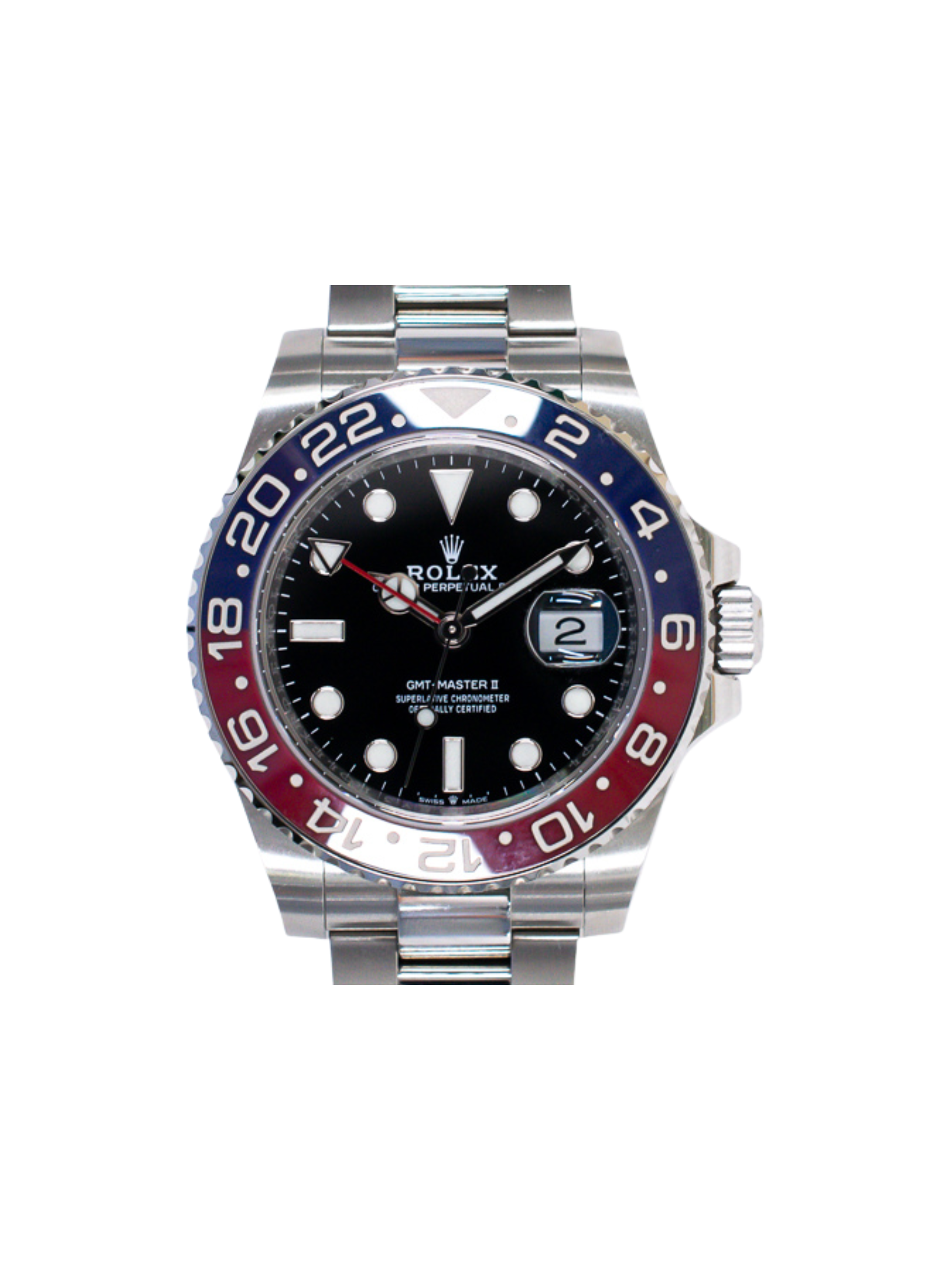 The 40mm Oyster case balances strength with elegant proportions. Its black dial features Chromalight hands and hour markers for optimal legibility in low-light conditions. The Cyclops lens over the date window enhances readability, a signature Rolex feature. This GMT-Master II allows tracking of two time zones simultaneously, making it ideal for frequent travelers.