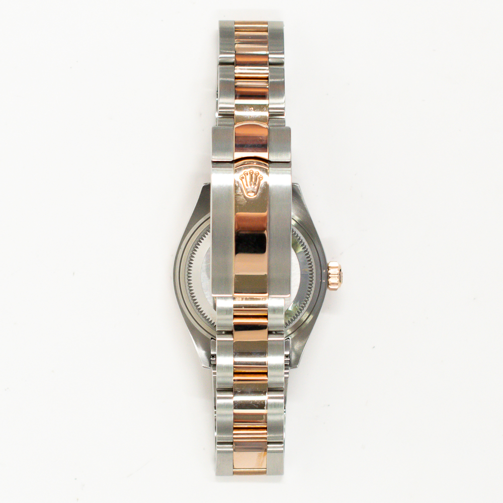Rolex pairs the case with a solid Everose gold and stainless steel Jubilee bracelet. Consequently, the bracelet offers superior comfort and visual refinement. The concealed Crownclasp further enhances the watch’s seamless and elegant profile.