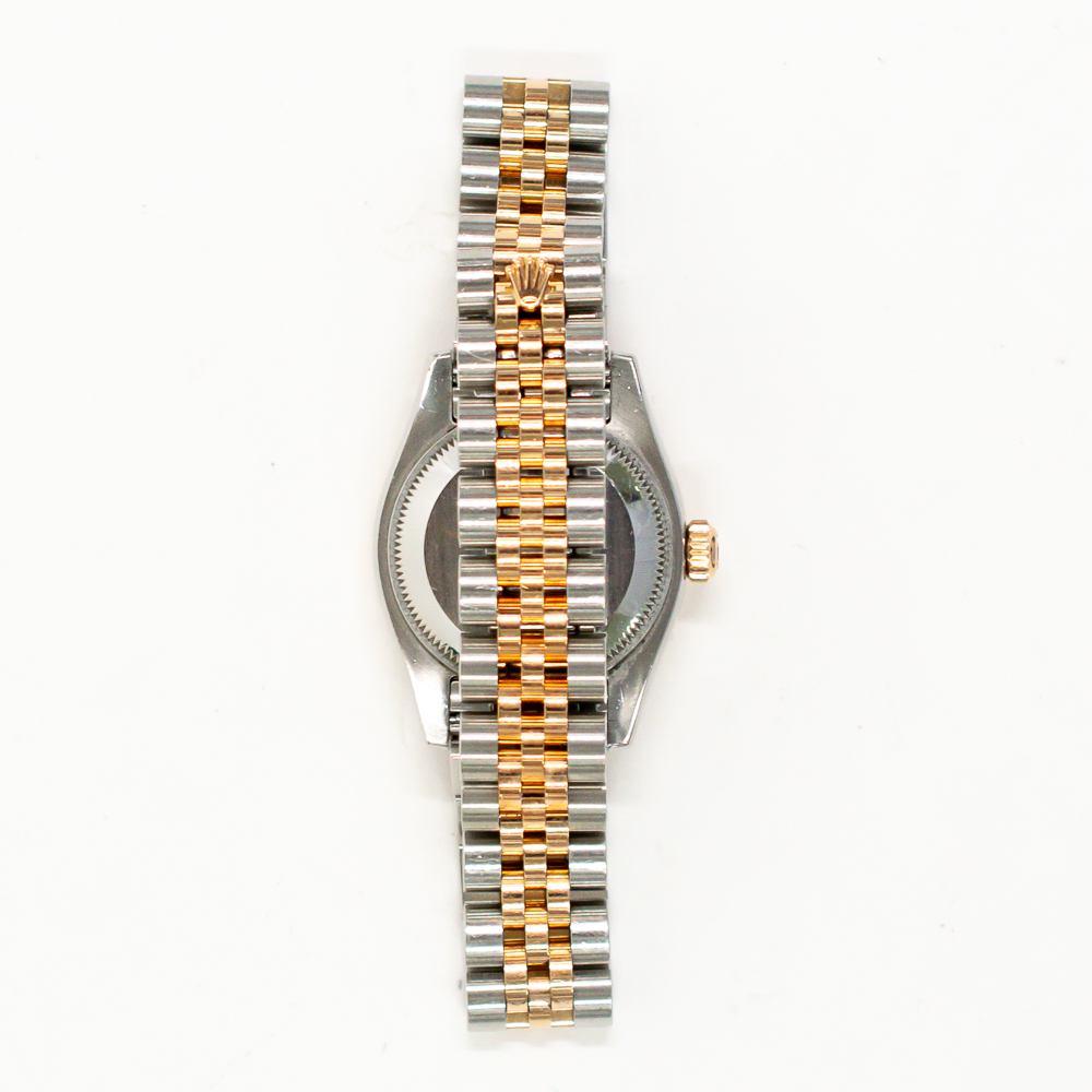 The Rolex Lady-Datejust Rose Gold and Stainless Steel with a White Diamond Dial blends feminine elegance with classic Rolex engineering. This model showcases a refined two-tone design that highlights its luxurious character. Rolex crafted the case and bracelet using stainless steel and Everose gold. This combination creates a warm contrast that feels sophisticated and timeless.