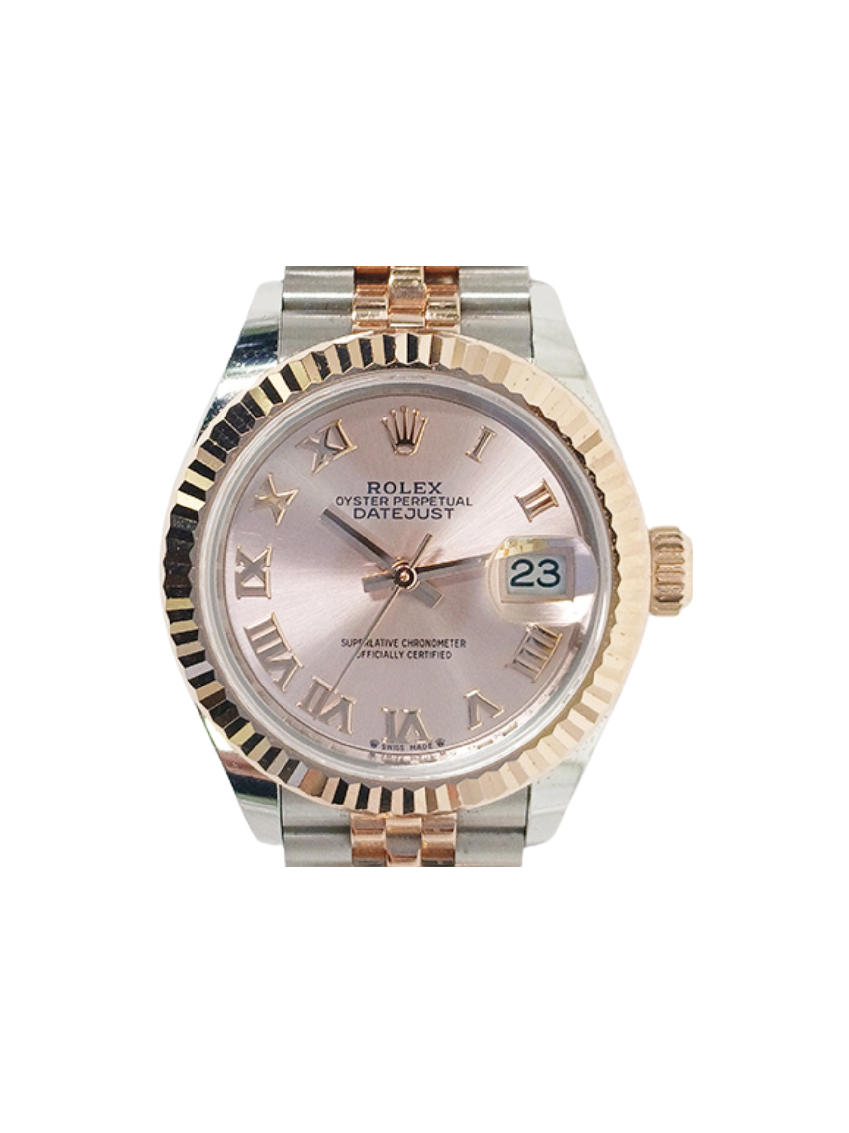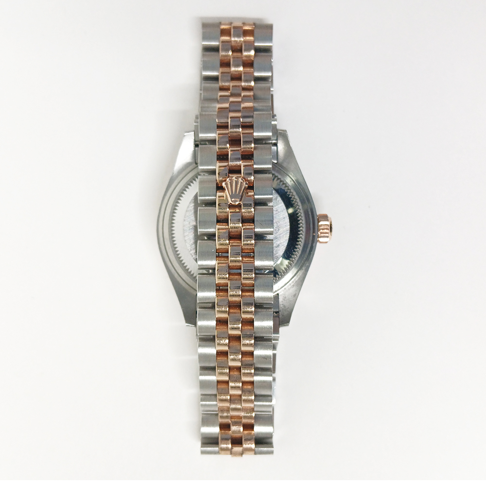 Rolex crafts the 28mm case from a combination of corrosion-resistant stainless steel and 18k Everose gold. As a result, the watch delivers durability, refined beauty, and lasting value. At the same time, the soft pink dial adds subtle charm and features Roman numeral hour markers for classic appeal. In addition, the Cyclops lens at three o’clock ensures easy date reading.
