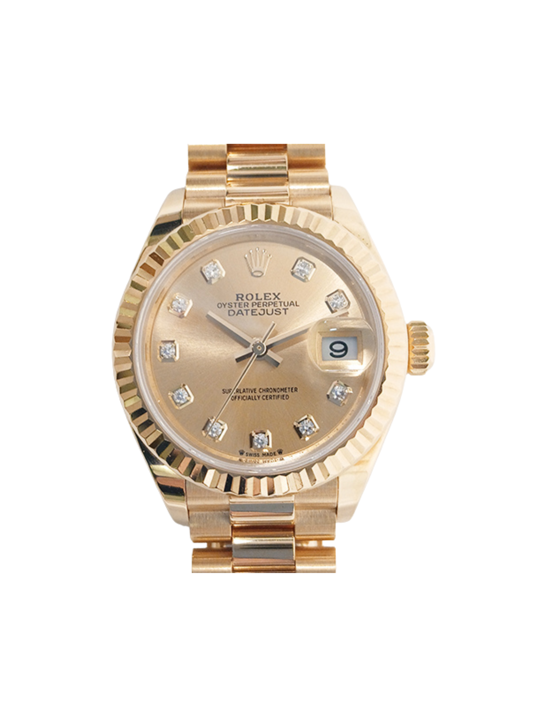 The Rolex Lady-Datejust Yellow Gold with a Champagne Diamond Dial is a symbol of timeless elegance and luxury. Crafted from 18k yellow gold, it offers unmatched durability while exuding a warm, radiant glow. Its 28mm Oyster case fits comfortably on the wrist, blending sophistication with everyday wearability. The champagne dial is adorned with sparkling diamonds, adding refined brilliance and making it instantly recognizable.