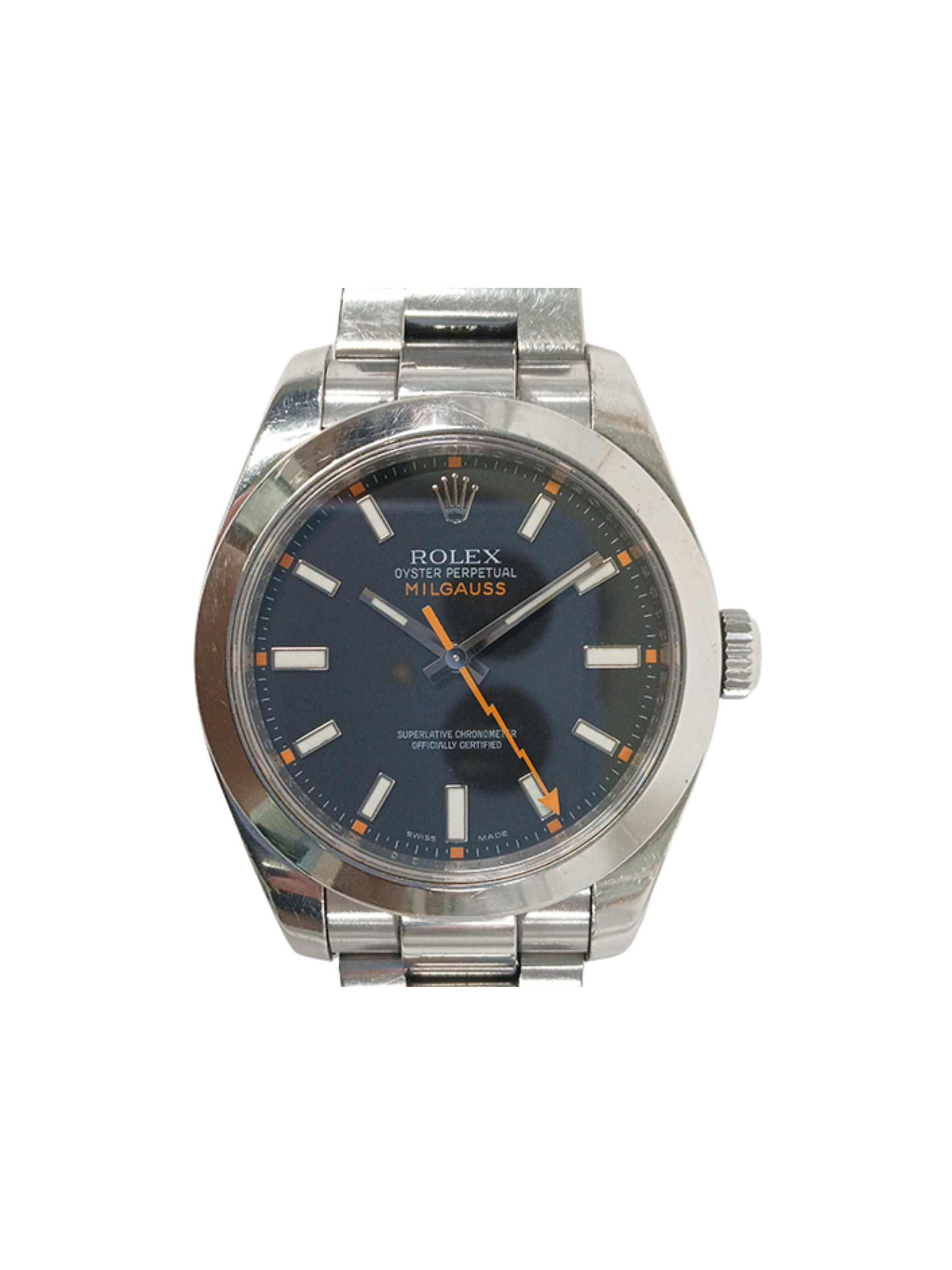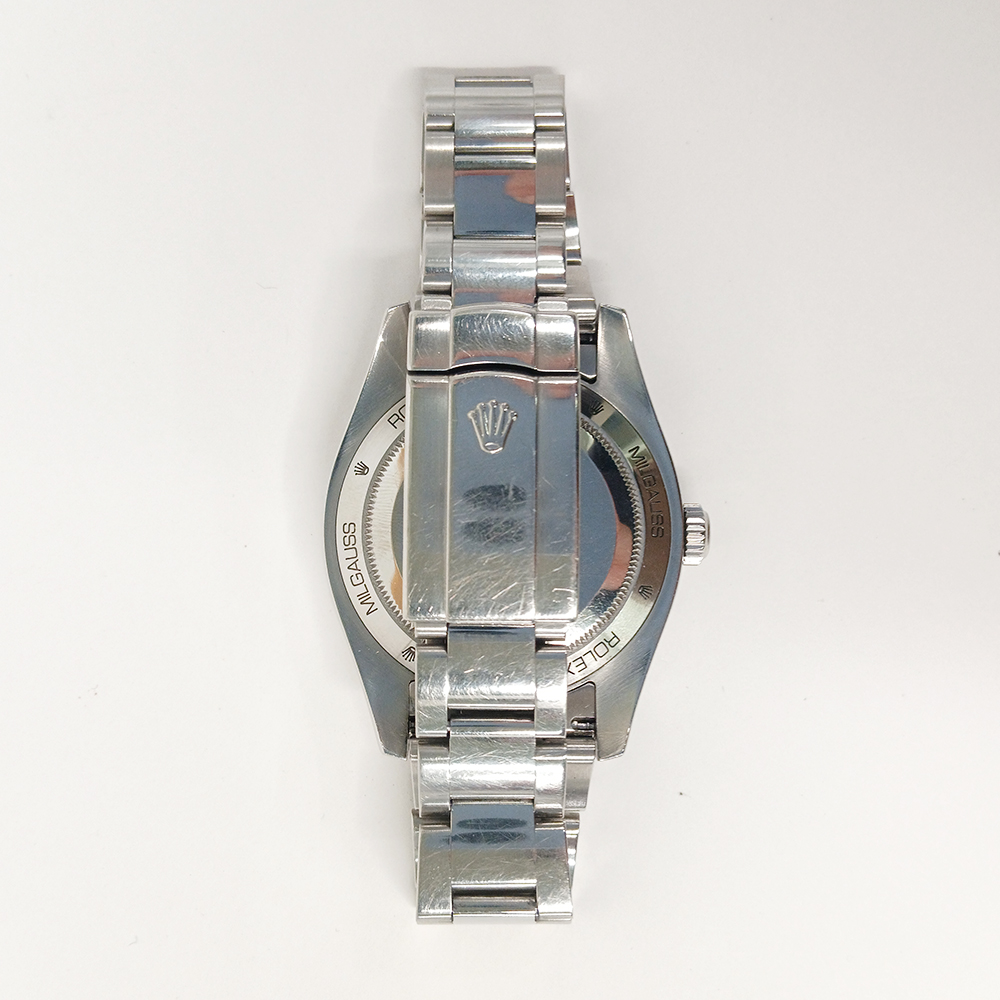 Most notably, this model features a unique green-tinted sapphire crystal, exclusive to the Milgauss line. The subtle green hue creates a striking visual effect, giving the watch a glow that collectors immediately recognize and admire. The classic Oyster bracelet enhances comfort, durability, and everyday wearability.
