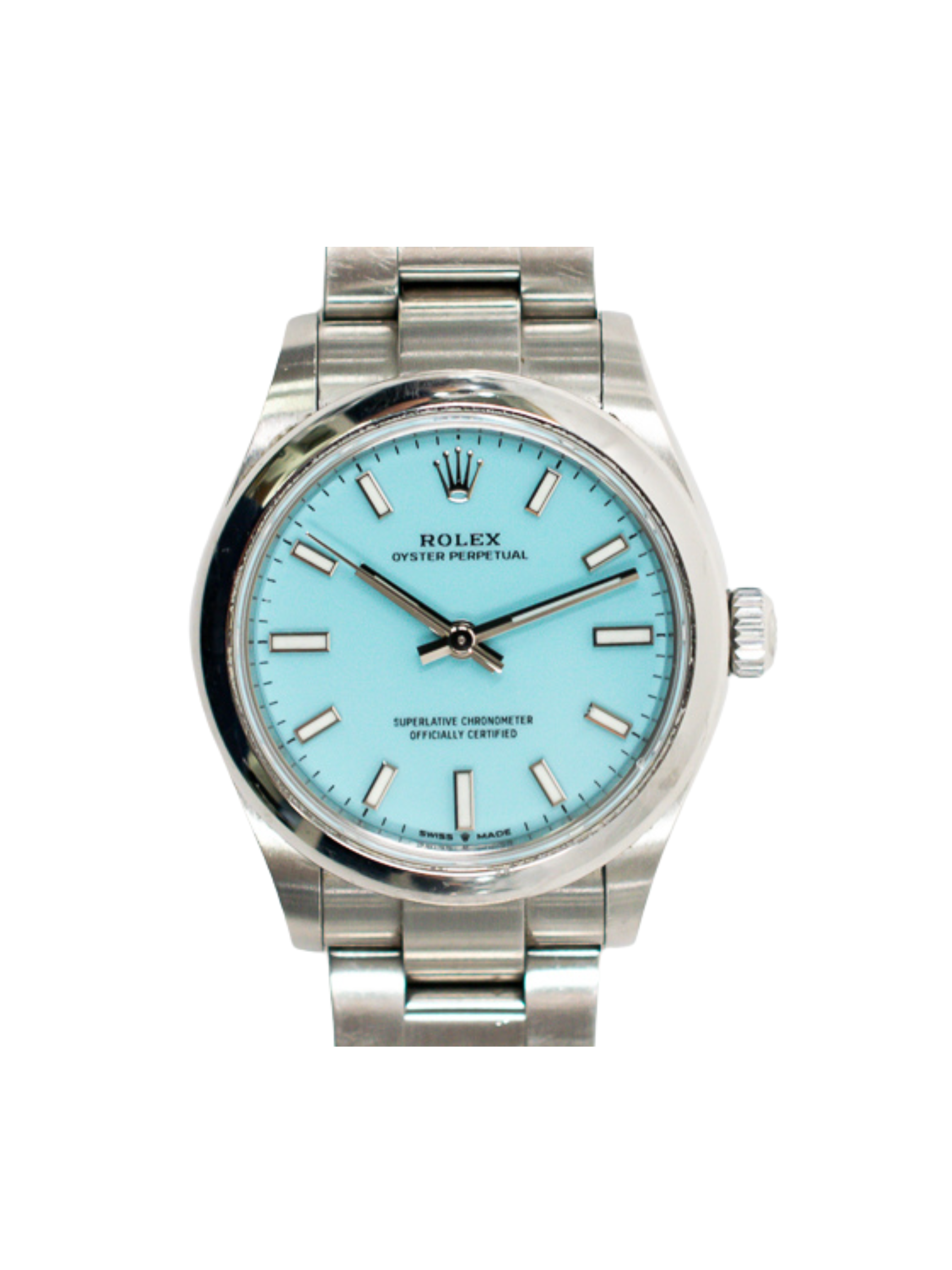 The Rolex Oyster Perpetual 31 Stainless Steel with a Turquoise Stick Dial is a stunning symbol of timeless elegance and modern charm. Crafted from durable Oystersteel, this watch embodies Rolex’s unmatched precision and craftsmanship. Its vibrant turquoise blue dial immediately captures attention, offering a refreshing and contemporary twist on a classic design.