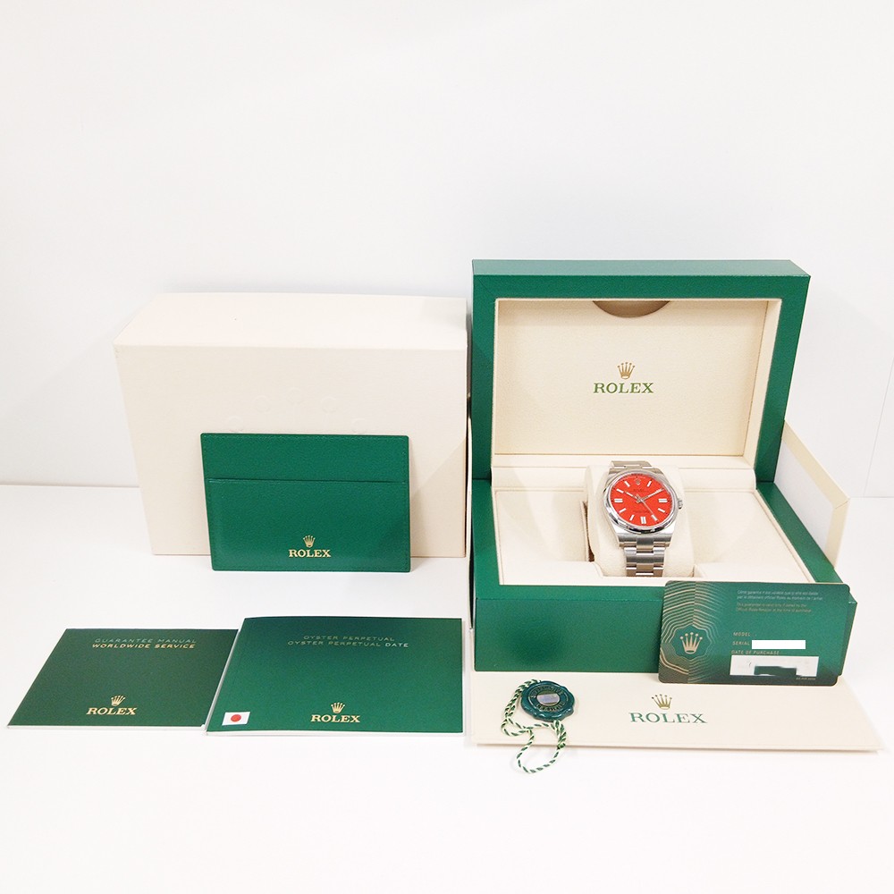 Rolex crafts the 41mm Oyster case from corrosion-resistant Oystersteel. As a result, the watch offers durability, balance, and everyday comfort. At the same time, the coral red dial creates striking contrast against the polished steel case. Applied hour markers and luminous hands ensure excellent legibility. In addition, the smooth bezel reinforces the watch’s clean and versatile aesthetic.