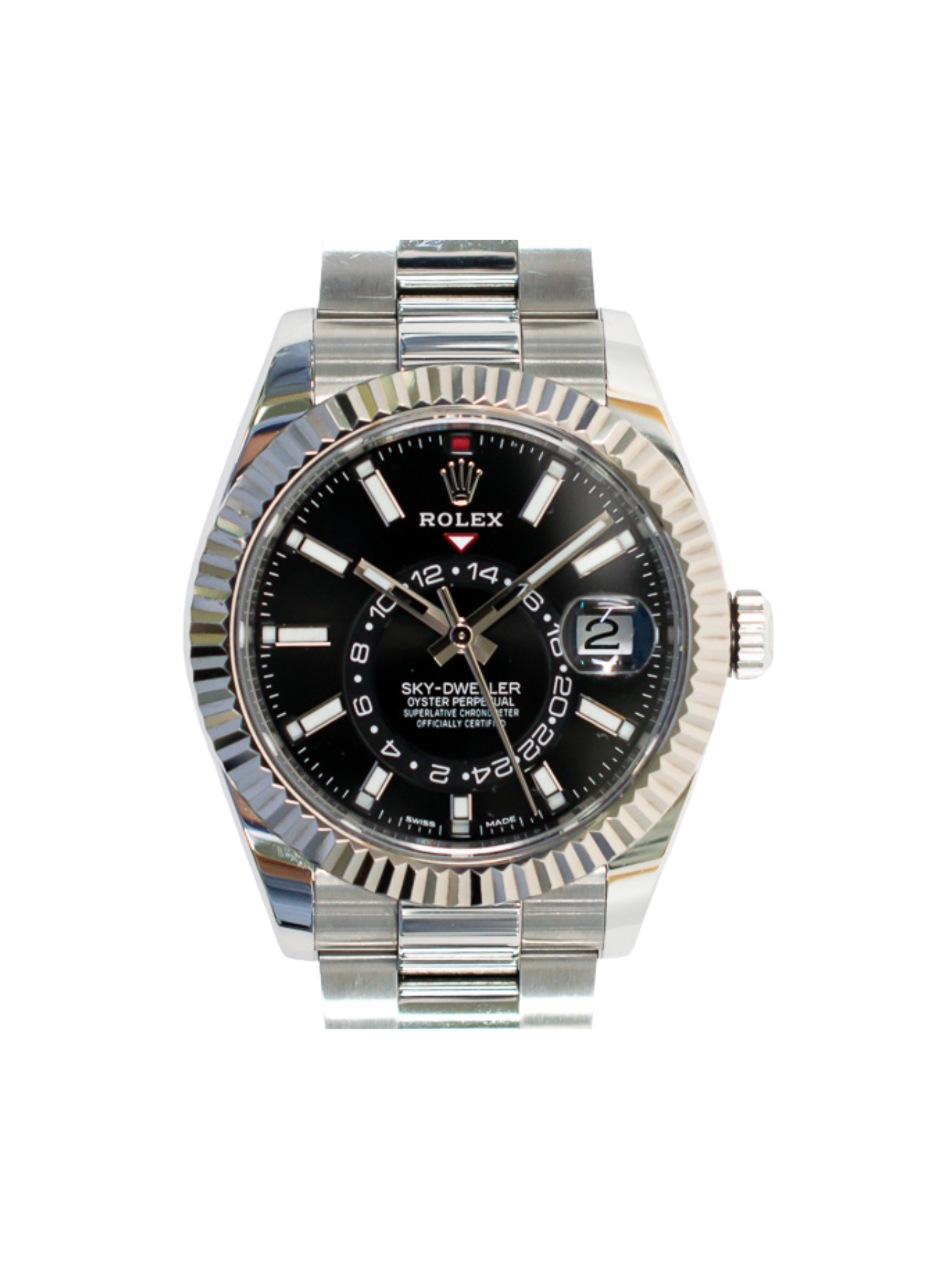 This Sky-Dweller features an Oystersteel case paired with a white gold fluted bezel, creating a striking two-tone effect. The dual time zone display allows travelers to read both home and local time at a glance.