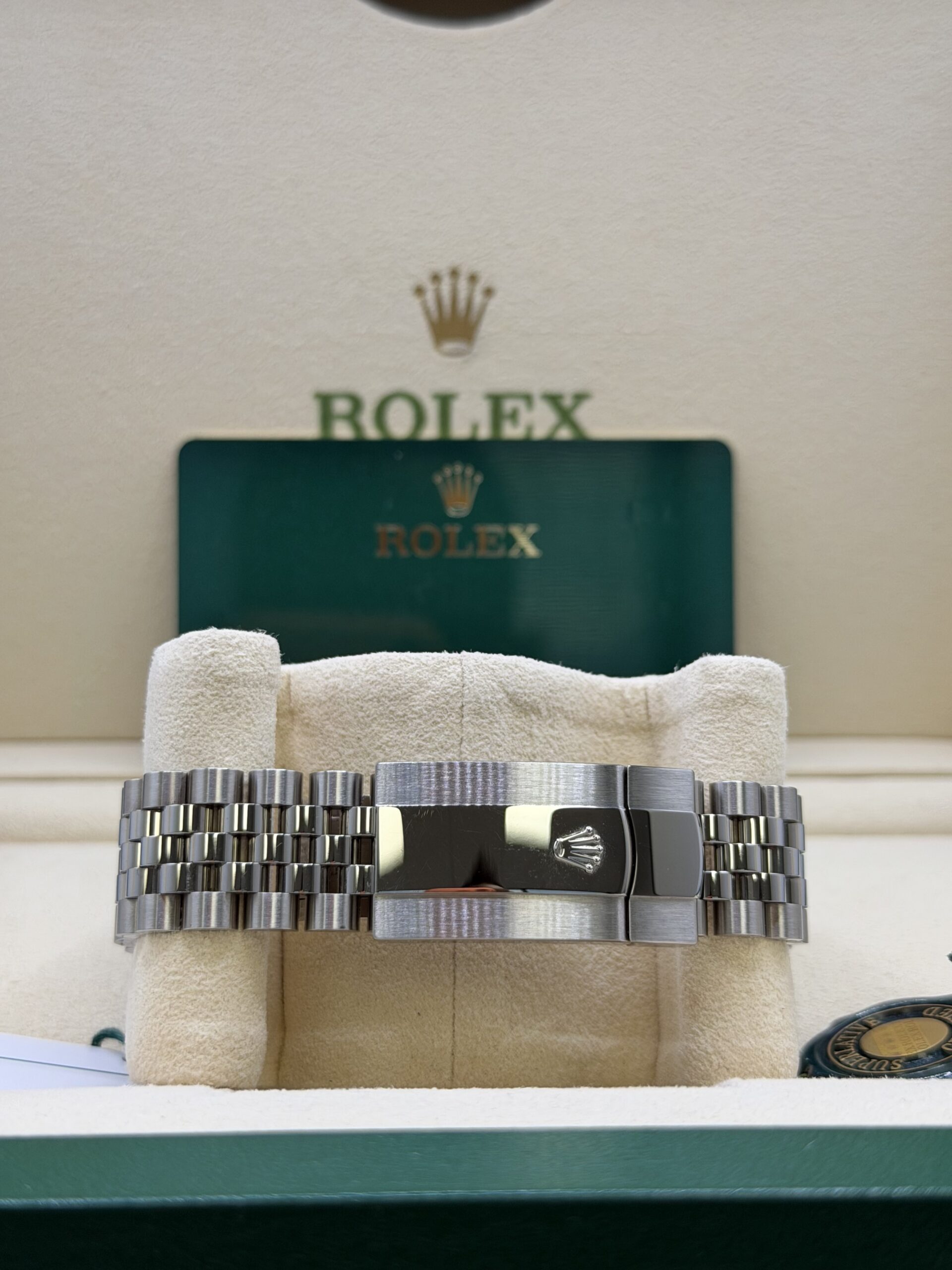 Rolex pairs Oystersteel with an 18k white gold fluted bezel. This combination delivers strength, prestige, and unmistakable presence. The mint green dial sets this model apart instantly. Its vibrant tone feels fresh, contemporary, and highly sought after.