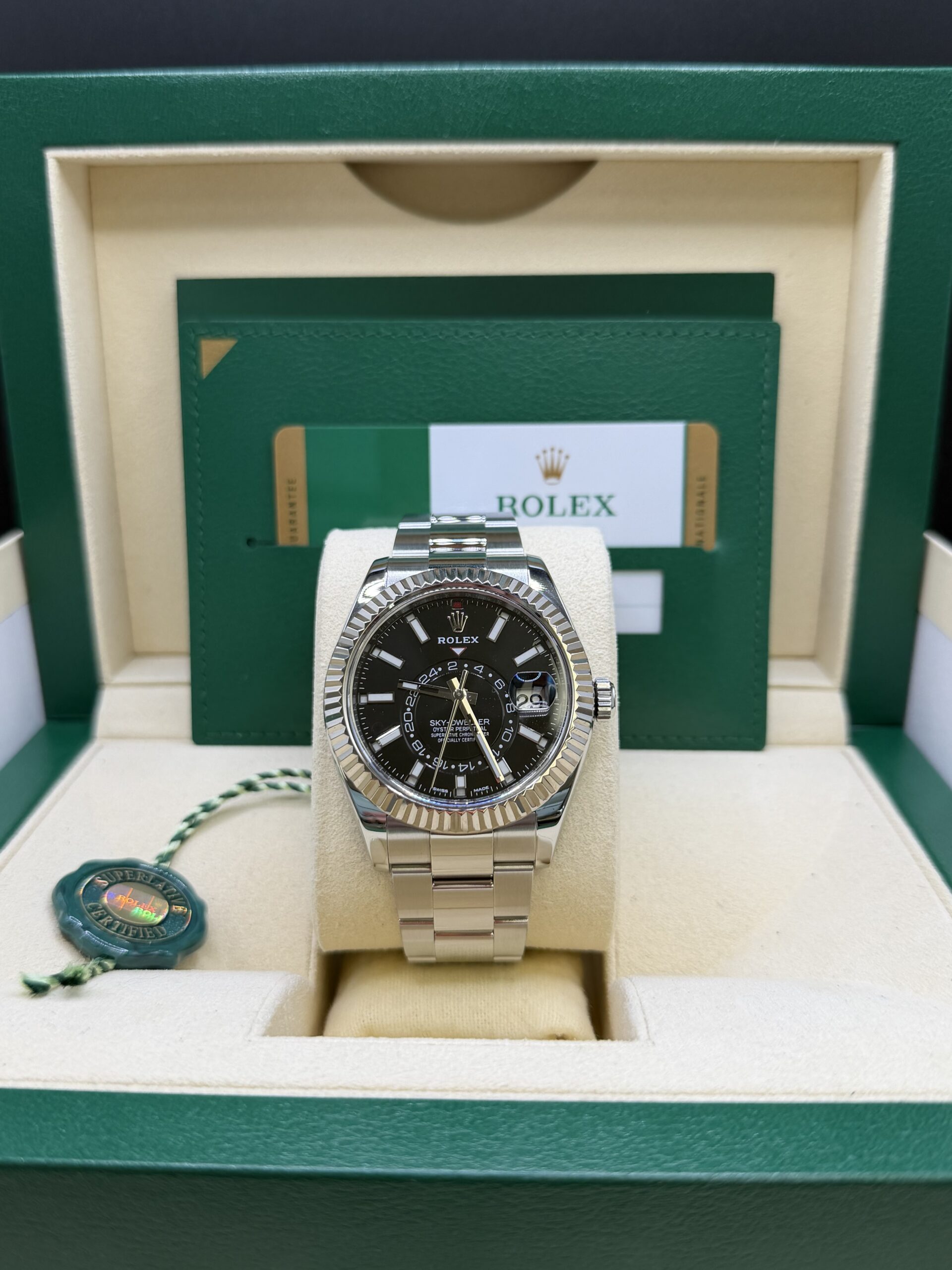 The Rolex Sky-Dweller Stainless Steel Black Dial represents one of Rolex’s most advanced and prestigious complications. Designed for global travelers, this model combines technical innovation with refined luxury.