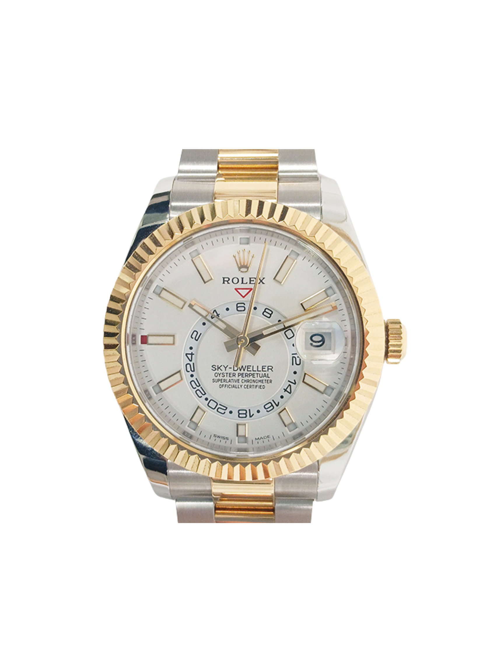 The Rolex Sky-Dweller Stainless Steel/Yellow Gold with a White Dial is a standout in Rolex’s collection of sophisticated travel watches. Combining robust Oystersteel with 18k yellow gold, it delivers both durability and elegance. The 42mm case houses a crisp white dial, providing exceptional legibility with luminous hands and hour markers. A fluted yellow gold bezel adds a signature Rolex touch, reflecting light beautifully from every angle.